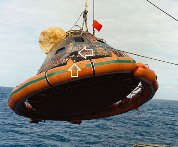 Описание снимка: «Командный модуль (CM) Apollo 11 сфотографирован, когда он поднимается на борт USS Hornet, основного спасательного судна для исторической миссии по высадке на Луну Apollo 11. Приводнение произошло в 11:49 (CDT) 24 июля 1969 года, примерно в 812 морских милях к юго-западу от Гавайев, всего в 12 морских милях от USS Hornet. 24 июля 1969 г». [5] Указателями отмечены аномальные отметины.