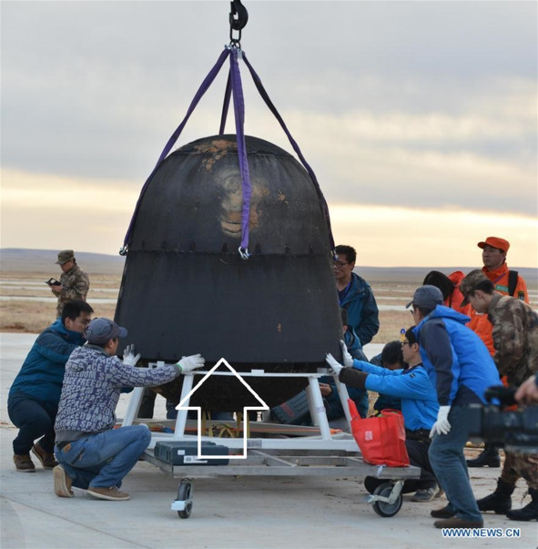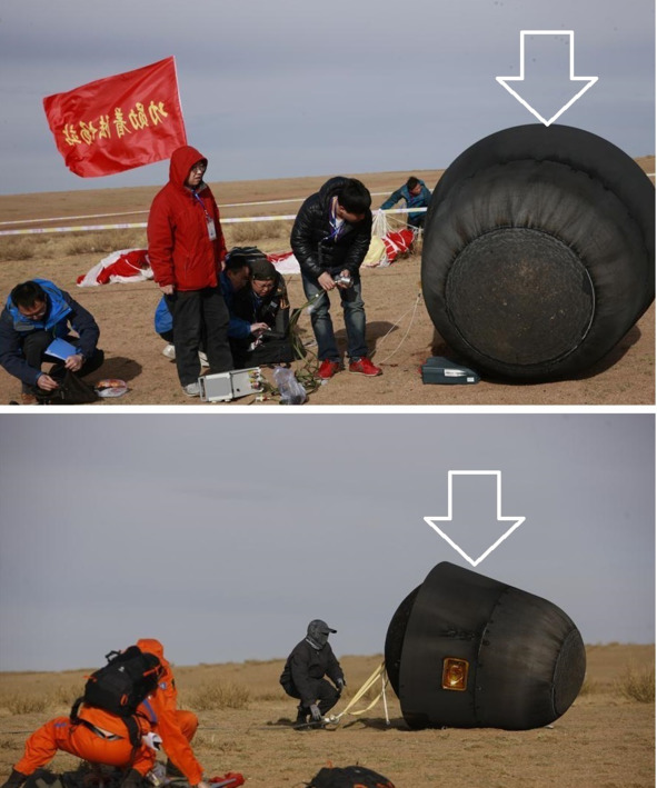Подпись к снимку: «Возвращаемая капсула первого китайского спутника для исследования микрогравитации „SJ-10“ вернулась на Землю». [6] Отличие от капсулы «Шэньчжоу-6» очевидно.