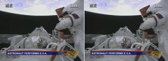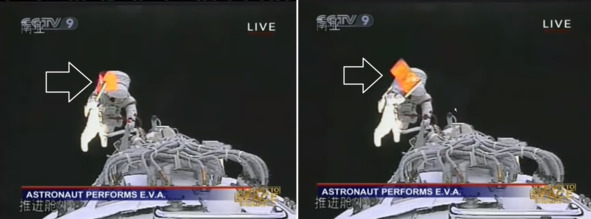 Действительно на кадрах китайской «трансляции» происходило много странных и необъяснимых явления, которые не характерны для настоящего выхода в открытый космос. Мало того, что китайские мистификаторы не создали дымку вокруг изображения Земли. Она обычно наблюдается при съемках в реальном космическом полете. Китайские сказочники сильно ошиблись в демонстрации поверхности Земли, которая висела над тайконавтом неподвижно. Изменение рельефа облаков минимальное и земля относительно китайского актера, играющего роль космонавта находится неподвижной. Аналогичные фильмы о выходе в космос космонавта Леонова и актера Уайта показывали совсем другую картину движения облаков и поверхности Земли в кадре. Кроме всего сказанного, у тайконавтов не было шлюзовой камеры. Оба китайских актера выходили в «открытый» космос прямо из «космического» аппарата. Важность шлюзовой камеры при таких мероприятиях не понимали и американские фальсификаторы. Губительное воздействие вакуума на электронику космического аппарата мистификаторы не учитывали. Не понравилось зрителям и странное освещение флага, хотя этот момент не сложно объяснить и оправдаться. Проблема была в том, что съемка справа не показывала наличие освещения этого флажка при съемке спереди.