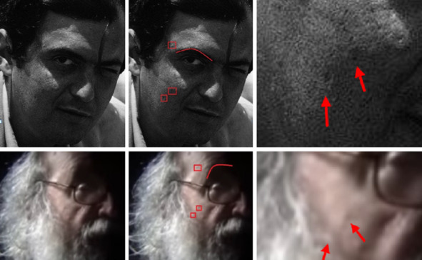 Впрочем, есть снимки пригодные для приблизительного сравнения. Ниже, верхняя фотография молодого Стенли, у которого правая бровь не вздернута и над правой бровью дефект кожи есть бородавка или родинка. На правой щеке два заметных дефекта. Сравнение этой фотографии с изображением лица на кадре, где освещена правая часть лица, показывает похожий изгиб брови, и есть аналогичные дефекты кожи. Кадры фильма «Stanley Kubrick Confesses To Faking The Moon Landings» [26] [27] показали нормальные кадры, не «зеркальные» кадры.