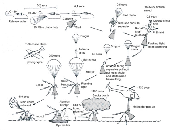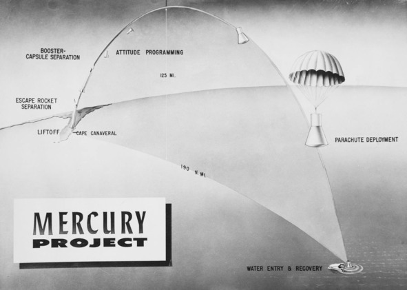 Американским обывателям подробно показывали о том, как капсула «Меркурий» будет возвращаться из космоса и опускаться на парашюте. Технические писатели НАСА при создании сайта, во времена появления Интернета, тоже не скрывали момент, как шли тренировки капсулы «Меркурий» по спуску капсулы на парашюте. Это делалось с использованием транспортного самолета ВВС США, с высоты более 10000 футов.