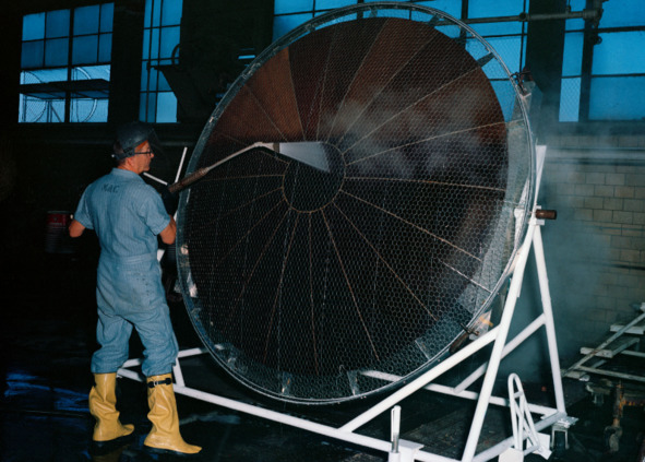 Американские конструкторы не отрицали, что при суборбитальном полете нужен тепловой экран (ТЭ), для защиты от аэродинамического нагрева. Подпись к фотографии НАСА: «S63—16250 (1963) – Рабочий чистит тепловой экран с металлическим каркасом, который будет использоваться на космических кораблях «Меркурий» [2] Технические писатели НАСА признают факт сильного аэродинамического нагрева при суборбитальных полетах, что отмечено в аннотации к фотографии НАСА. На кадре S64—19600 показано, что ТЭ сильно обгорел и покрыт копотью. Боковые поверхности этого аппарата американские технические писатели не показывают. На тепловом экране следы обжига почему-то имеют странные геометрические фигуры. Посреди поверхности просматриваются белое пятно правильной круглой формы. Такие отметины не должны были проявиться при аэродинамическом нагреве. Ниже представлено изображение «теплового экрана».