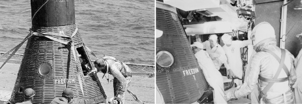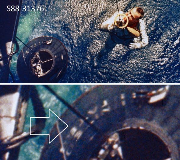 Аннотация к фотографии НАСА: «JSC2004-E-19882 (5 мая 1961 г.) – Астронавт Алан Б. Шепард-младший спасен вертолетом морской пехоты США 5 мая 1961 г». [4] Аналогичной фотографии НАСА, которая показывала тот же момент в шоу с участием актера Гриссома, тоже существует, хотя парашюта рядом не наблюдается. Видно, что вода заполнила капсулу. Она частично выливается из открытого люка. Вертолет попытался поднять аппарат, наполненный водой. Самое интересное в этом изображении не отсутствие плавающего полотна парашюта. Интересно то, что на фотографии, где изображена капсула с выливающейся водой, актер Гриссом плавает рядом в скафандре, который не может его удержать на плаву. В кадре виден вертолет под номером 32. Согласно мифологии НАСА этого клоуна вынимали из воды после того, как капсула утонула. Кроме этого два вертолета над одной точкой разместить невозможно. Ситуация очевидна: капсула тонет, Гриссома рядом и не тонет.