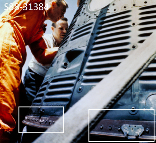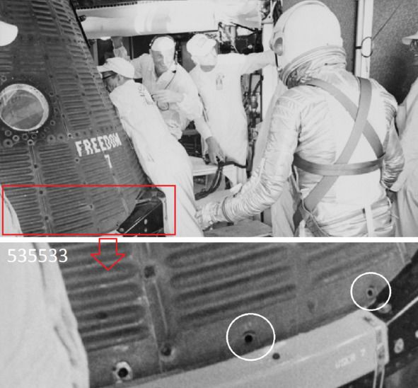 Описание фотографии НАСА: «S88—31384 (5 мая 1961 г.) – Астронавт Алан Б. Шепард-младший, пилот Mercury-Redstone 3 (MR-3), изображен возле своей капсулы Freedom 7 во время послеполетной инспекции на борту авианосца ВМС США». [12] Места, где и должна быть копоть и нагар, отмечены. Указаны места, где расположены многочисленные отверстия.