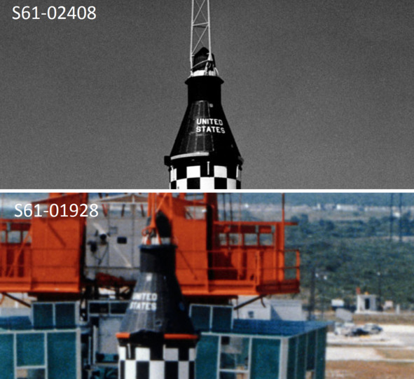 Подпись к фотографии НАСА, слева: «S61—01927 (5 мая 1961 г.) – Меркурий-Редстоун 3 (MR-3), первый пилотируемый космический полет Соединенных Штатов, запущен с мыса Канаверал в рамках суборбитального полета». [6] Подпись к фотографии справа: «S61—01928 (5 мая 1961 г)». [7] Белая надпись «FREEDOM-7» после приводнения ничем не отличается от подписи, которая наблюдалась на поверхности капсулы перед стартом. Нет никаких признаков копоти или нагара на боковой поверхности в нижней части и на белой краске. При реальном суборбитальном полете следы аэродинамического нагрева и копоти должны были быть при любом развитии событий. По отдельным участкам изображений на этих кадрах можно допустить, что изображена одна и та же капсула. Фокус простой: съемка аппарата делается заранее в отдельном помещении. Потом ее грузят на морское судно в район посадки, где «космонавта» обнаруживают спасателя. На старте можно использовать дублера. Для трансляции можно использовать съемки «тренировки» с изображением крупным планом Алана Шепарда. Эти мелкие проблемы фальсификации первого полета решались без проблем.
