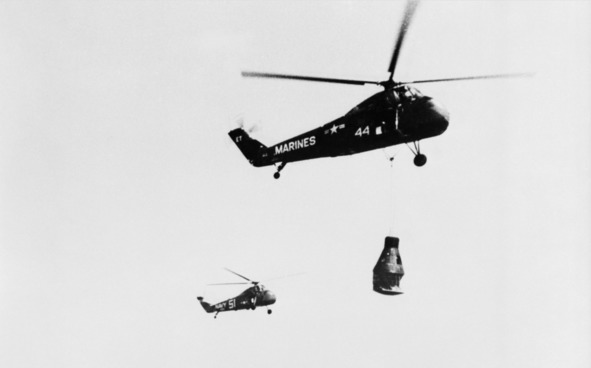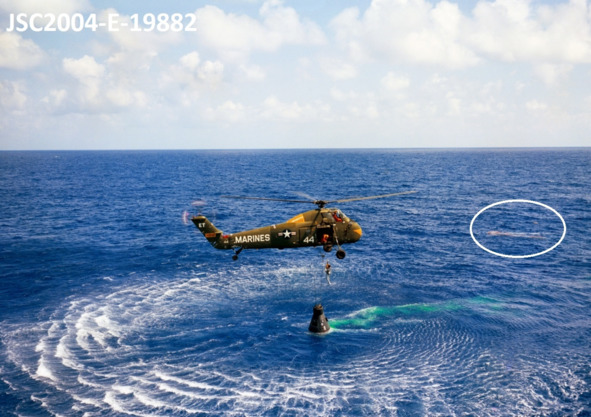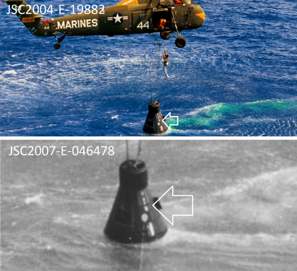 Верхняя фотография, описание: «JSC2004-E-19882 (5 мая 1961 г.) – Астронавт Алан Б. Шепард-младший спасен вертолетом морской пехоты США 5 мая 1961 г., завершив свой суборбитальный полет, недалеко от восточного побережья Флориды». [13] Нижняя фотография: «JSC2007-E-046478 (5 мая 1961 г)». [14] Указателями указаны на белые полосы.