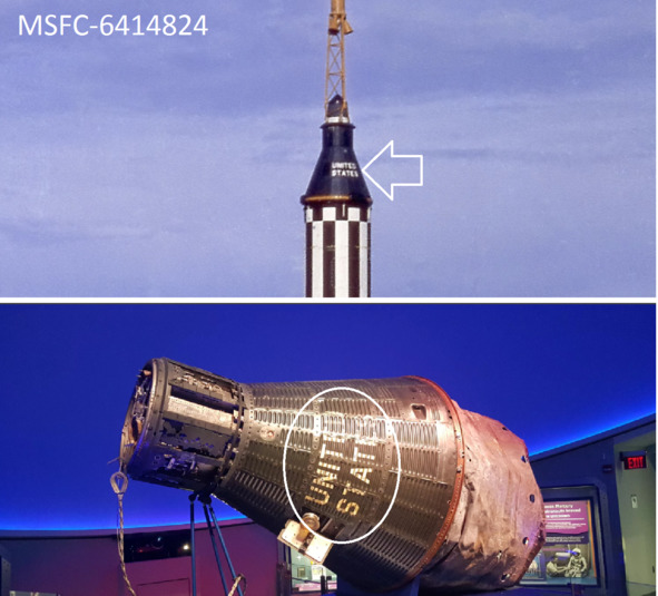 Необходимо отметить, что на капсулах «Меркурий отсутствуют обтекатели, которые бы защищали ее от аэродинамического нагрева при полете с большой скоростью в плотных слоях атмосферы. В такой ситуации белая краска должна была потемнеть, это как минимум. Аргументы о том, что краска была огнеупорная, не подтверждаются данными формулы аэродинамического нагрева, которая показывает наличие температуры на поверхности капсулы при полете вверх до 2000 градусов Цельсия. Эта белая надпись хорошо видна после «приводнения» капсулы. Подпись к следующей фотографии НАСА: «S88—31376 (5 мая 1961 г.) – Астронавт Алан Б. Шепард-младший, пилот суборбитального космического полета MR-3». [11]