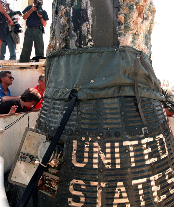 Даже длительное нахождение в воде не сильно изменило белую надпись на аппарате Гриссома, которая однозначно опровергает реальность этого «пилотируемого полета».