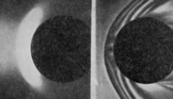 Рис. 3. Фотографии ударной волны перед сферой диаметра d = 15 мм: слева – в разреженном газе; справа – в сплошной среде. На больших высотах атмосфера очень разрежена и средняя длина свободного пробега l молекул между двумя соударениями становится сравнимой с характерным размером движущегося в атмосфере тела d или рассматриваемой области потока. Поэтому методы расчёта течения, применяемые в аэродинамике и газовой динамике, основанные на представлении о газе, как о сплошной среде, непригодны и приходится прибегать к кинетической теории газа. При высоких температурах газа, имеющих место, например, при очень больших скоростях полёта, течение может сопровождаться эффектами возбуждения молекул, их диссоциацией, ионизацией». [6] По указанной причине в статье БСЭ «Аэродинамика разряженных газов», в разряженной атмосфере ударная волна образуется на нижней части космического объекта. Но по мере того, как такое тело с высокой скоростью входит в плотные слои атмосферы, ударные волны воздействуют своеобразными полосами на боковую часть указанного объекта.