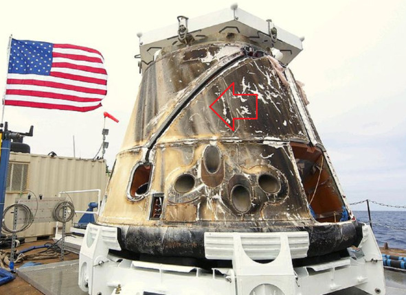 Полосы обгорания на боковой поверхности видны на американской капсуле «Драгон» после приводнения. [7] Фотография выполнена, якобы, 15 марта 2016 г. Сведения о параметрах защиты от аэродинамического нагрева: «Теплоизоляционный щит герметичного отсека абляционный, его испарение уносит с собой тепловую энергию. Негерметичный отсек от стыковывается перед завершением миссии и сгорает в атмосфере». [8] Американские чудотворцы не предусматривают абляционную защиту на боковой поверхности такой капсулы. В Будущем это обернется большими неприятностями. В отличие от американской капсулы, проверенный космический корабль «Союз» имеет абляционную защиту на боковой поверхности. Этот проверенный способ защиты от аэродинамического нагрева уже не раз спасал от гибели космонавтов, которые находились в этом аппарате при спуске. Но, как видно на фотографии, такие же полосы обгорания присутствуют и на боковой стороне КА «Союз». [9]