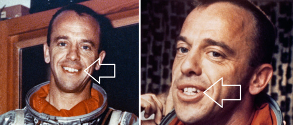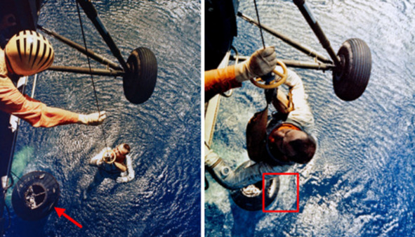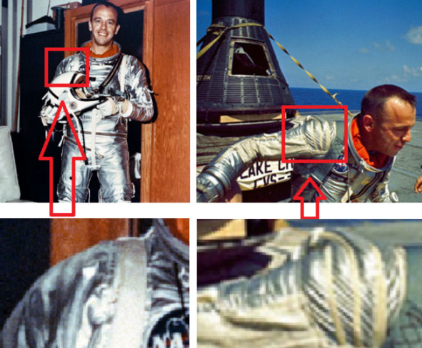 Фотография НАСА слева: s62—00379. Подпись НАСА: «S62—00379 (20 февраля 1962 г.) Вид астронавта Джона Х. Гленна-младшего, доктора Уильяма Дугласа, летного хирурга астронавтов и специалиста по оборудованию Джо Шмитта» [12].Фотография НАСА справа: s62—00222. Подпись НАСА: «S62—00222 (20 февраля 1962 г.) Вид астронавта Джона Х. Гленна-младшего и специалиста по оборудованию Джо Шмитта» [13]. Фотографии «зеркальные», но это не спасает ситуацию. Перед нами оплошность американских обманщиков. Фотографии, выполненные в разное время, представлены на сайте НАСА, как фотографии, выполненные 20 февраля 1962 года. На одной фотографии гермошлем имеет отверстия в верхней части, на другой этот же гермошлем таких отметин не имеет.