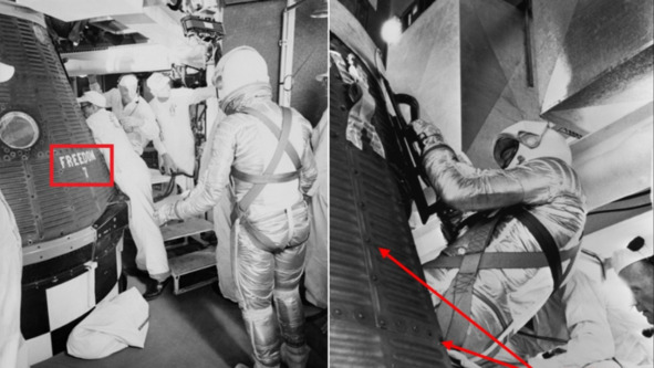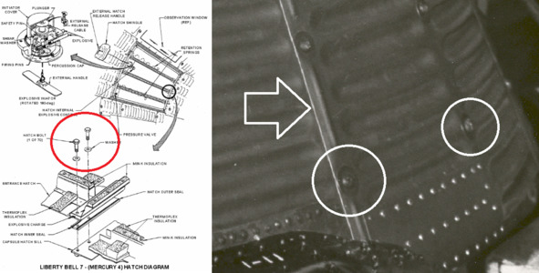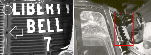 Безобразное качество «космической» техники признается американскими обманщиками в официальных выдумках, в духе плохого, голливудского сценария: «Джон Гленн разместился в космическом корабле Меркурий-Атлас-6 в 11:03 UTC 20 февраля 1962 года. Люк был закрыт в 12:10 UTC. Большинство из 70 болтов были закручены, и тут обнаружился сломанный болт» [4] Проблемы с качеством «космической техники» были продемонстрированы на подготовительном этапе миссии. Это видно при увеличении фрагментов снимков, которые размещены на сайте НАСА. На фотографии НАСА 62ma6—55 наблюдается отверстие в верхнем слое капсулы рядом с левым плечом Глена. Казалось бы, ничего страшного, показана капсула в процессе подготовки к «космическому полету. Потом это отверстие будет закрыто. Но фотография Гленна с Президентом США, сделанная после завершения «полета» Гленна 23 февраля 1962 г., показывает то же самое отверстие на том же самом месте. Придумать нелепые отговорки, например, о том, что сначала отверстие было закрыто перед стартом ракеты с дырявой капсулой, а потом снова открыто перед встречей Гленна с Кеннеди, можно. Но подобные выдумки выглядят не очень убедительно! Не меняется главное, ненадежность конструкции первого слоя капсулы с креплением на маленькие винтики. Далее, изображения одного и того же места на поверхности аппарата. Слева, отверстие неправильной формы слева от Гленна. На снимке, справа, это же отверстие в левом углу кадра. Данная аномалия не является соплом двигателя или отверстием сброса жидкости.