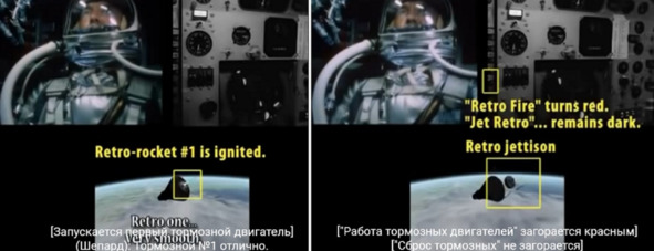 Как минимум такие подписи после реального космического полета должны были сильно потемнеть, как максимум белая, обычная краска должна была или сгореть, или осыпаться с поверхности, после таких аномальных воздействий на капсулу и краску. На сайте НАСА, в источниках информации близких к НАСА и США имеется много так называемых, зеркальных фотографии, где левая сторона становится правой и наоборот. Описание миссии Гленна не обошлось без использования таких кадров. Вот один из примеров далее. Кадры трансляции «полета» «космонавта» Гленна. На двух кадрах слева телекамера, например, расположена справа от «космонавта». На кадре справа, эта же телекамера находится слева от Гленна.