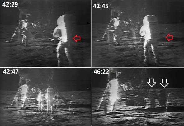 Можно заменить часть лунного грунта, который вначале был ярко белый, а потом стал выглядеть темным. В эти периоды времени можно было частично удалить капли воды или инея с объектива телекамеры. Из трех «стержней», следов от капель воды, для обозрения публики фигурировал средний «стержень». Это был след от конденсата. На кадрах «41:41», «41:42», «41:45» были заметны два отрезка. На кадре «42:03» остался один «стержень», который и вызвал бурные обсуждения в Интернете.