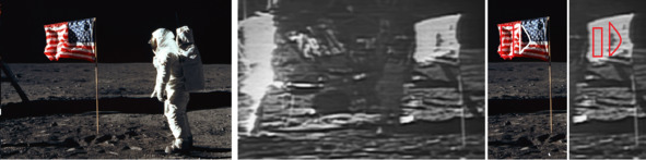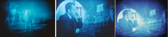 На фотографии видны два вертикальных участка, которые находятся в тени. Справа кадр из «лунной трансляции». На кадре лунной трансляции в центре участок в тени всего один. Теневой участок с левого края полотна флага отсутствует на всем протяжении «лунной трансляции». В заключительной части фильма НАСА, который содержит кадры знаменитой «трансляции» с американской «Луны» показанной 21 июля 1969 года, в «День Участия», есть множество необычных сюжетов. Они прямо указывают на тот факт, что зрителям показывают художественный фильм, который был снят заранее. В его структуру вставлены эпизоды, созданные до начала самого события, которое показали в этом шоу. Американский Президент Ричард Никсон тоже решил поучаствовать в грандиозном спектакле для всего человечества. В фильме Никсон решил пообщаться в «прямом эфире» с «космонавтами» США по телефону. Казалось бы, чего проще, снять простенький эпизод без глупостей и ошибок? Но американские обманщики не искали легких путей! Они в который раз понаделали много нелепых и абсурдных действий со стороны оператора, который снимал актеров на «Луне», и со стороны звукорежиссеров, и странных передвижений самих актеров. Когда Никсон начинает общаться с «космонавтами» на «Луне», возникает странная картина: Капсула непонятной формы и в ней два человека.