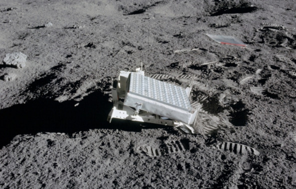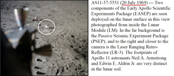 В местах посадки Аполлон-11 (16—24 июля 1969), Аполлон-14 (31 января – 9 февраль 1971) и Аполлон-15 (26 июля – 7 августа 1971) были оставлены лазерные отражатели, местонахождение которых подтверждено посредством лазерной локации с Земли“. [1] На сайте НАСА эти „исторические события“ запечатлены. При рассмотрении фотографий НАСА с американской „Луны“ обнаруживается всегда много забавных и нелепых момента. В случае с демонстрацией фотографии американского уголкового отражателя из шоу „Аполлон-11“ наблюдается странное указание в дате, когда была сделана эта фотография с номером AS-37-551. На изображении американской „Луны“ есть все признаки того, что это событие произошло после завершения „лунных прогулок“, когда американские „космонавты проникли в «Лунный модуль» и закончили загрузку американского «лунного грунта». Если верить хронометражу пребывания американцев на «Луне», который предоставили американцы общественности, это время завершения «лунной» миссии и подготовка к взлету с поверхности «Луны». Официальная дата взлета американцев с «лунной поверхности»: 21 июля 1969 года! Обманщики, вероятно, запутались в датах из-за разницы часовых поясов. В одних мифах фигурирует 20 июля, в других 21 июля. Фотография показывает лунную поверхность, на которой в центре виден уголковый отражатель, отмечен окружностью.