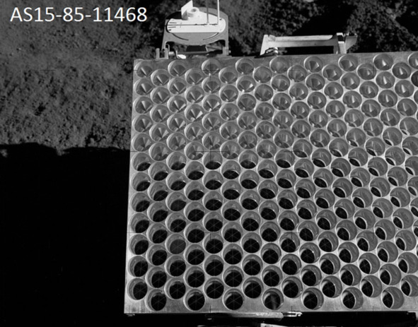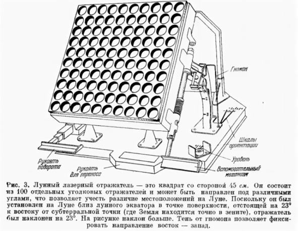 Подпись к фотографии с изображением уголкового отражателя из шоу «Аполлон-15» (крупный план): «AS15-85-11468. ALSEP documentation photo». [6] Это приспособление для улавливания лунной липкой пыли. Она попадает внутрь цилиндра! Пыль при старте взлетной части «ЛМ» просто обязана была попасть в эти углубления и привести отражатель в нерабочее состояние. Само такое устройство, где отражающий свет элемент спрятан в таком углублении, требует тщательного правильного наведения на источник лазерного освещения, в опыте с лазерной локацией. Любое отклонение, любое покрытие этих светоотражающих поверхностей делает отражатель непригодным для подобных экспериментов. Советские пособники американских обманщиков в 1971 году в журнале «Успехи физических наук» опубликовали статью американских фальсификаторов и схему «лазерного отражателя». Это квадрат со стороной 45 см. [9]