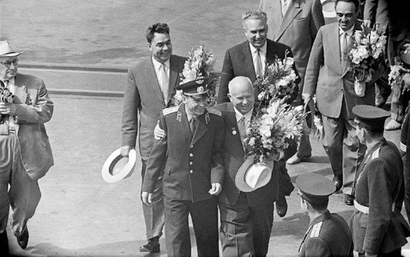 Помимо звания Героя Советского Союза, Герман Титов был награжден двумя орденами Ленина (17 июня и 9 августа 1961 года), орденами Октябрьской Революции (21 февраля 1985), Трудового Красного Знамени (15 января 1976) и «За заслуги перед Отечеством» III степени (7 сентября 1995), а также медалью «За освоение целинных земель» (август 1961). Герман Титов также был награжден орденами Болгарии, Монголии, Индонезии, ГДР, Югославии, Румынии, Сирии и Конго. В честь космонавта названы кратер на обратной стороне Луны, аэропорт Барнаула и остров в Тонкинском заливе (Бухта Халонг). На фотографии: Леонид Брежнев, Никита Хрущев, Анастас Микоян встречают Германа Титова на Внуковском аэродроме». [9] Космонавт Герман Титов не страдал «звездной слепотой». Он первым с помощью обычной кинокамеры сделал знаменитый кадр из иллюминатора с изображением звезд на черном небе, при полете над освещенной солнечным светом стороной Земли. Позднее, защитники НАСА объявят эти точки дефектами фотографии, киносъемки! Но это явная ложь.