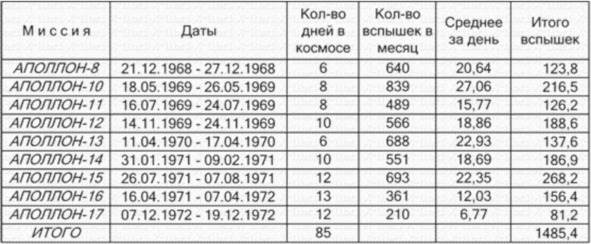 Самым важным моментом книги Рене, наверное, необходимо признать его попытку исследовать защиту от радиации у «космических аппаратов» из программы «Аполлон». Здесь все было прекрасно: никакой защиты от солнечных вспышек у американцев не было. Этот факт признавали сами фальсификаторы. Рене составил таблицу возникновения солнечных вспышек с период осуществления «лунных полетов». Из этой таблицы следует, что американским «космонавтам невероятно повезло.