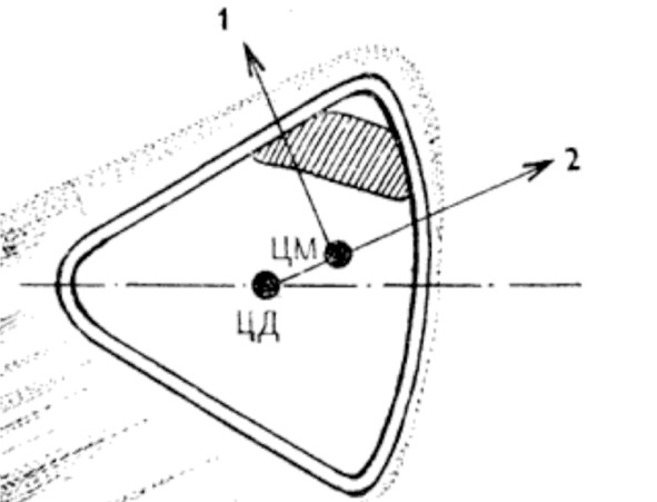 Рис.1. Смещение центра масс спускаемого аппарата: 1 – подъемная сила; 2 – направление полета; ЦМ – центр масс; ЦД – центр давлений; заштриховано место наиболее массивного оборудования. Так что смещенный центр масс располагают между днищем и центром давления. Такая центровка обеспечивает устойчивое положение спускаемого аппарата в воздушном потоке (днищем вперед), а также несимметричное обтекание спускаемого аппарата. Благодаря последнему, появляется подъемная сила, перпендикулярная набегающему потоку“. [2] Автор в своей публикации сообщает о „двойном погружении в атмосферу“. Благодаря этому методу гасится высокая скорость аппарата. Возникновение подъемной силы было использовано в полетах советских космических аппаратов. Они снижали скорость своего входа в атмосферу с помощью двойного погружения в атмосферу: „Для спускаемого аппарата с системой управления движением возвращение с Луны может решаться и иным путем.