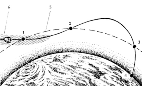 Рис.2. Двойное погружение в атмосферу: 1 – первый вход в атмосферу; 2 – выход из атмосферы; 3 – второй вход в атмосферу; 4 – посадка; 5 – условная граница атмосферы; 6 – коридор входа. При достаточно крутом входе в атмосферу, когда угол входа больше 2°, траектория спускаемого аппарата даже при малых постоянных значениях угла атаки и небольшом коэффициенте качества (в пределах 0,2—0,3) содержит восходящие участки, т.е. возможно рикошетирование аппарата. В этом случае допустимо двойное погружение спускаемого аппарата в атмосферу (рис. 2). При подлете к Земле со второй космической скоростью при угле входа 3° спускаемый аппарат после первого погружения выходит из атмосферы на эллиптическую орбиту и затем вновь входит в атмосферу, но уже на расстоянии 10000 км от точки выхода. Однако обеспечение точного места посадки при этом затруднительно, поскольку при отклонении скорости на 0,001 (около 8 м/с) от расчетной приводит к отклонению дальности точки вторичного входа в атмосферу на 300 км, а отклонение угла наклона траектории на 0,1° – к отклонению дальности на 180 км. Чтобы эта неопределенность уменьшилась, траектория должна иметь как можно больший угол наклона в точке вылета из атмосферы. Правда, величина этого угла ограничивается запасом аэродинамического качества спускаемого аппарата, а также допустимым пределом максимальных перегрузок (в ином случае будут более глубокие погружения в атмосферу на первом участке). На промежуточном участке полета управление аппаратом невозможно, и поэтому накопленное отклонение по дальности сможет быть скомпенсировано только на участке второго погружения в атмосферу». [2]