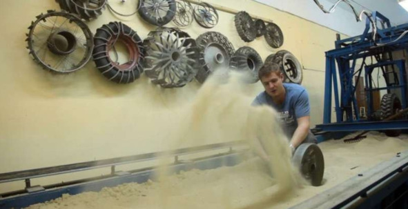 Как же на самом деле были выполнены съемки передвижения по американской «Луне»? Для этой цели в большом ангаре необходимо создать макет места прилунения. Такие макеты, если верить отрывочным сообщениям представителей НАСА, действительно существовали. По понятным причинам фотографии этих грандиозных макетов необычно больших размеров не осталось, или их не представили широкой общественности. Но остались различные макеты лунной поверхности, которые были созданы не только в структуре НАСА. Эти глобусы Луны имели довольно точный рельеф, который повторял настоящие элементы реальной лунной поверхности. Фотографии таких макетов можно найти в большом количестве в открытом доступе. Американским сказочникам ничего не мешало создать из песка и связующего клея создать макет лунной поверхности относительно большого размера. Конечно, появление огромного живого актера среди «лунных» гор и долин этого макета было бы совсем не логичным и опрометчивым поступком. Такое соотношение человека и лунного рельефа, которое показано на фотографии ниже, обманщики из НАСА не показывали.