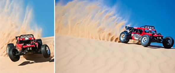 Американские фокусники при съемке своего «луномобиля» такие приспособления не использовали. Видимо крепления для куклы были спрятаны на сидении водителя за спиной и внизу в районе его зада. Впрочем такие детали фокуса можно всегда решить. Сравнение Леонида Коновалова движения «лунного» ровера обманщиков с передвижением макета красного автомобиля по сухому песку было не совсем удачным. Но в данном случае кинорежиссер пытался доказать, что подъем пыли на высоту более 1 метра на Земле невозможно осуществить при пробуксовке задних колес транспортного средства. Леонид Коновалов сделал скоропалительный вывод: «Использование уменьшенной модели позволяет добиться эффекта высокого вылета частиц песка, в 2 раза выше самой модели. Это почти как на Луне. Таким образом, часть задачи – создание эффекта движения как бы по Луне – решается с помощью уменьшенной модели». [1] В доказательство своего заблуждения он продемонстрировал изображение выброса «султанов» песка.