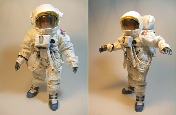 Руки, ноги, голова куклы имели шарнирные соединения. Поэтому этими частями манекена можно было управлять, поворачивать их в нужную сторону, вверх, вниз, влево, вправо. Стекло гермошлема опускалось и поднималось. При этом за стеклом можно было увидеть лицо конкретного «космонавта» НАСА. В самых мельчайших деталях были созданы ранец, обувь, перчатки, шланги. Шевроны и полоски на скафандре соответствовали тому местоположению этих нашивок, которое указывалось американской мифологией, при демонстрации живого актера, одетого в такой костюм. Но учесть все было невозможно.