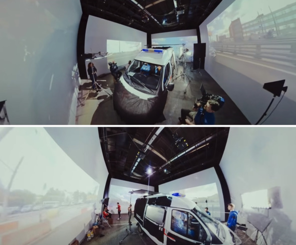 Зрители видят, как актер Гоша Куценко ездит по городу, а на самом деле он некуда не едет, а находится в студии. Куклы Гоши Куценко при этом делать не нужно. Он сам прекрасно сыграет роль в таком фильме. Если верить режиссеру этого сериала, то съемки, которые были показаны в фильме, были сделаны в неподвижной машине скорой помощи, в небольшой киностудии. На стенах этого небольшого помещения размещены проекционные экраны, где демонстрируются кадры с передвижением автомобиля по различным улицам города. Режиссер в фильме рассказывает, что метод «хромакей» обошелся бы создателям сериала очень дорого. Режиссер подчеркнул, что дешевые и вполне эффективные съемки по указанным методом комбинированной съемки, были хорошо известны давно. Это действительно так. Методы Рирпроекции были распространенными в творчестве все того же Стенли Кубрика. Метод очень простой, дает реалистичное изображение и он очень дешевый при использовании. Схема съёмки актёров в декорации движущегося автомобиля, который расположен в студии и никуда не едет.
