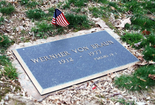 Так выглядит надгробие на могиле Вернера фон Брауна на кладбище Айви-Хилл в городе Александрия, штат Виргиния. Рупор американской пропаганды «Википедия» сообщает следующее: «С января 1970 года – заместитель помощника администратора НАСА по планированию, с 1972 года работал в промышленности на посту вице-президента фирмы „Фэрчайлд спейс индастриз“ в Джермантауне, штат Мэриленд. После ухода из НАСА в 1972 году прожил всего пять лет и умер от рака». [5]