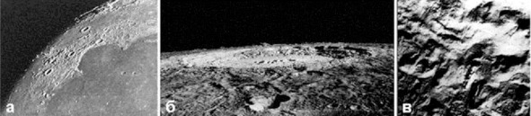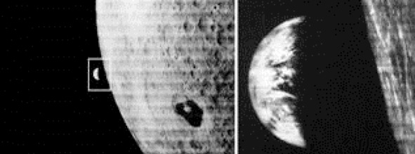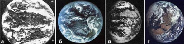 Подпись к изображениям Земли: «Илл.2. Виды далёкой Земли, снятые «автоматами» до и во время полётов «Аполлонов»: а,б) американскими ИСЗ АТС-1 и АТС-3 (декабрь 1966 и январь 1968) в,г) советскими автоматическими кораблями «Зонд-5» и «Зонд-7» (сентябрь 1968 г и август 1969 г.)». [2] Аноним утверждает: «По этой методике изображения сначала фотографируются. Затем фотопленка проявляется и просматривается, считывается с помощью фотоэлемента. И уже сигналы с фотоэлемента через антенну «Орбитера» «не спеша» передаются на Землю. Качество принимаемого изображения получается гораздо лучшим, чем при прямой телепередаче, но вся процедура требует много времени. В результате, если «Рейнджер» (прямое ТВ) успевал за 20 минут падения передать несколько сот изображений, то «Орбитерам» для передачи примерно такого же количества изображений требовалось около двух недель. На многих снимках, полученных от «Орбитеров», заметны продольные полосы (илл. 8). Это следы работы считывающего устройства.