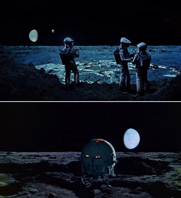 Это кадр фильма Стенли Кубрика: цветное изображение Земли. Никаких проблем. При хорошем финансировании и при желании создателей шоу, можно создать несколько штук таких дисков Земли. Раскрасить картон не сложно.
