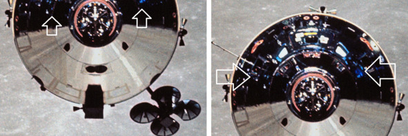Фотография НАСА, слева: «S69—19644 (4 января 1969 г.) – этап подъема лунного модуля (LM) 5 в зоне окончательной сборки на подвесном подъемнике перемещается на тележку для проверки выкатывания». [10] Сопло ЖРД светлое, без чехла. Фотография НАСА, справа: «S69—32396 (4 апреля 1969 г.) – Внутренний вид здания пилотируемого космического корабля Космического центра Кеннеди (KSC), показывающий, что лунный модуль (LM) 5 перемещается с рабочего стенда для стыковки с его адаптером лунного модуля космического корабля (SLA)». [11] На пятах стойки 4 щупа. В «космосе» США наблюдается три таких объекта. В сборочном цехе, на этих же местах, фигурировало 4 щупа. Сопло ЖРД в «космосе» темное, в сборочном цехе сопло светлое.