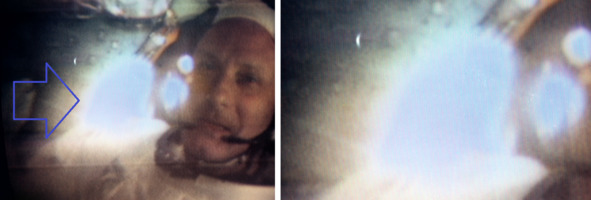 В этой гипотезе есть слабое место, которое проявляется в том, что на внешней стороне стекла, это особенно хорошо видно на снимке 5389, наблюдаются пятна, напоминающие капли воды. Вот чего в настоящем космосе точно быть не могло, при ярком солнечном освещении. Некоторые американские пропагандисты ссылаются на другое обстоятельство, пытаясь оправдать появление за стеклом иллюминатора голубого фона, который напоминает голубое земное небо. Они утверждают, что за стеклом наблюдается край атмосферы Земли голубого цвета. Но эта гипотеза тоже не имеет реальных оснований. Снимок по признанию американских клоунов был сделан 20 июля 1969 года, в тот момент, когда по версии НАСА, эти «космонавты» были на значительном удалении от Земли. При любом варианте, подобные снимки, в самом лучшем случае, можно считать очень подозрительными. Вероятно, что данные снимки были выполнены на самолете «нулевой гравитации». А за стеклами отразилось или земное небо, или интерьер салона самолета, куда была помещена капсула «Аполлон-11». Ниже увеличенный фрагмент фотографии 5389, где наблюдаются капли воды, которые могли попасть на стекло после дождя, например. Могли эти капли появиться после помещения мокрой капсулы в самолет.