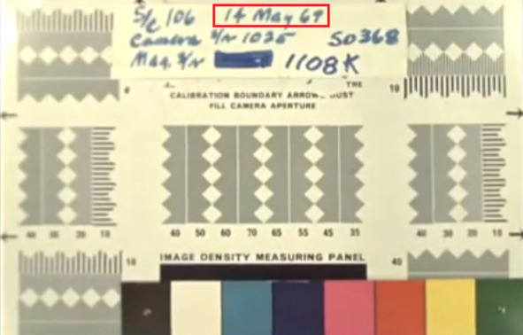 Вероятность ошибки указания даты можно теперь смело отмести. Сомнительной выглядит предположение о том, что при выдаче пленки со склада за 4 дня до начала миссии, такую заставку изготавливали специалиста монтажа. Указывать эту дату после завершения изготовления фильма НАСА, как день получения пленки тоже очень сомнительная гипотеза. В титрах, как правило, указывают дату изготовления всего видеоролика. В этом фильме есть и другие кадры с датой: 14 мая 1969 год.