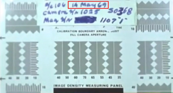 Необходимо также отметить, что указанные «дефекты» в отличии от реальных дефектов пленки имеют длительное время демонстрации и стабильное положение относительно «ступени». Это свидетельствует о том, что данные блики вызваны другими причинами, а не качеством пленки фильма. Защитники НАСА всегда находят оправдания по таким необычным явлениям на пленках видео материалов: плохой качество кадров, результат пересъемки и оцифровки. Но на этих кадрах есть другие необычные признаки обмана. В этом фильме встречаются еще одна заставка с указанием даты «14 мая 1969 год». Если нумерация пленки ранее была «1108 К», то в этой заставке указан номер пленки «1109 I». Заставка сделана до того, как был осуществлен сам «полет»? Опять допущена ошибка в указании даты изготовления фильма? Можно ли было на пленке делать такие заставки в ее начале, при выдаче пленки со склада?