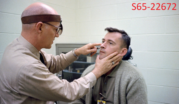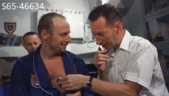 Такие моменты были продемонстрированы. Например, фотография НАСА с описанием события медицинского осмотра: «S65—22672 (21 марта 1965 г.) – Астронавт Джон В. Янг, пилот миссии „Близнецы-Титан-3“, проходит обследование уха, горла и носа у доктора Л. Балленбергера, капитана ВМС США. Осмотр проходил во время физического обследования экипажа GT-3 за два дня до старта». [4] Но это были изображения, которые показывают обследование в другой день, а не перед самым стартом миссии. Система допуска космонавтов СССР к полету могла прекратить участие пилота в экспедиции на орбиту, если его состояние здоровья перед самым стартом не соответствовало критерия допуска. Аналогичная ситуация была и после приземления. Советских космонавтов первыми встречали медицинские работники, которые, как правило, укладывали космонавтов на носилки и делали предварительный медицинский осмотр с определением пульса, кровяного давления психического состояния космонавта. Последующие фотографии НАСА демонстрировали подобные осмотры, которые происходили почему-то когда угодно, только не в день старта.