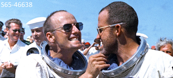 Фотографии НАСА, где сфотографирован момент осмотра медиком американского загоревшего «космонавта»: «S65—46634 (29 августа 1965 г.) – Астронавт Чарльз Конрад-младший проверил частоту сердечных сокращений у врача после миссии Близнецы-5». [6] «Космонавт» успел загореть. Пока летал в «космосе». Но главная проблема этого медицинского исследования в том, что он делался не сразу после приводнения. Актер успел переобуться, помыться, побриться. Он еще речь произнес после приводнения на палубе корабля перед этим осмотром. В этом не сложно убедиться, просматривая фотографии, которые фиксировали момент после приводнения капсулы этих клоунов. На фотографии НАСА 46638 этот же артист одет в «скафандр» (он и не скафандр вовсе). Этот же актер на фотографии не побритый и не умытый: «S65—46638 (29 августа 1965 г.) – Астронавт Чарльз Конрад-младший настраивает восьмидневную бороду астронавта Л. Гордона Купера для операторов, когда они находятся на борту основного спасательного судна после их полета в Близнецы-5». [7] Клоуны радовались жизни, демонстрируя на лицах отличный, гавайский загар. Изображения американских «космонавтов» излучают оптимизм и невероятную бодрость, сразу же после приводнения.
