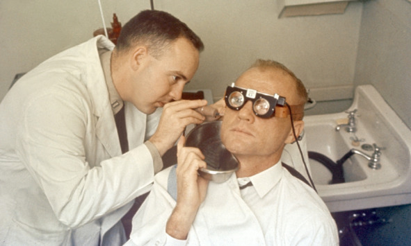 Подпись к фотографии медицинского осмотра: «S64—14849 (1962) – Механизм обследования астронавта Джона Гленна-младшего (полукруглые каналы) проверяется путем подачи холодной воды в ухо и измерения влияния на движения глаз (нистагм)». [10] Это просто поразительно! Непонятную процедуру промывки ушей этого клоуна американские обманщики зафиксировали. Медицинское обследование после приводнения они решили не показывать. Причина забывчивости простая: Никакого осмотра медиками этого «космонавта» не было! Он и так был веселый и чрезвычайно бодрый. Актеру не нужен осмотр.