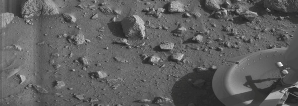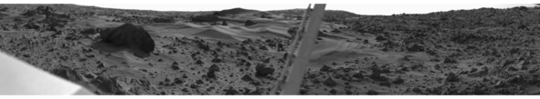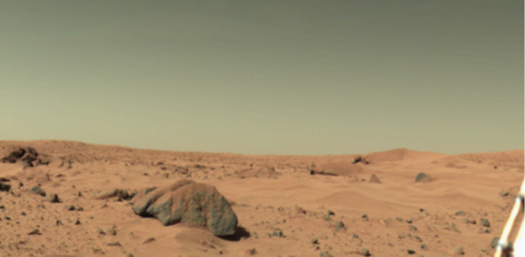 Светлое, «оранжевое» небо, на реальном Марсе быть не может в принципе. Этот факт американских обманщиков не смущал. На черно белых фотографиях Марс выглядел ярко белым. Небо на американском «Марсе» не имело более никаких признаков темного оранжевого цвета. Пыльные дюны и большой валун. Объект в центре снимка – метеорологическая штанга. В некоторых фотографиях НАСА, которые демонстрировали закат Солнца, «марсианское небо» становилось голубым, синим.
