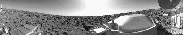 Наверное, американцев так и подмывало обнаружить на своем Марсе следы инопланетян, но потом они все-таки осознали, что такая версия не найдет поддержки среди реальных ученых, вызовет много ненужных и лишних вопросов. Поэтому от обнаружения «марсианских живых организмов, американские обманщики решили отказаться. Сильно разряженная атмосфера Марса, более слабое освещение Марса Солнцем не могли на реальном Марсе создать светлое небо. На Земле, в плотных слоях атмосфера подобное рассеивание света и образование купола светлого неба возможно. На Марсе такое явление, как наличие светлого неба, проявляться не должно. На высоте 35 километров от Земли небо становится черным, темным. Аналогичная ситуация должна была наблюдаться с поверхности Марса. Но этого не произошло. Американские фантазеры, обманщики пустились во все тяжкие! Своими фотографиями с поверхности своего фальшивого «Марса» они выдали себя полностью! Макет автоматической марсианской станции «Викинг-1». Рядом с макетом расположена «марсианская фотография», где «марсианское небо» проявилось, как ярко белый «купол». Все предельно ясно: это не марсианское небо.