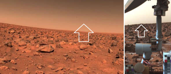 Фото «Викинга-1», сделанное «Марсианским разведывательным спутником» в декабре 2006 года. Пята стойки стерильная, не наблюдается пыль, которая должна была попасть в пяту. На этом чудеса не закончились. Сначала, «марсианское небо» было представлено, как светло оранжевое. Объясняли этот цвет обманщики тем, что над поверхностью Марса летали частички оранжевого грунта. При этом никаких признаков марсианской бури не было. Видимость была отличной. Основы для длительного полета таких частичек в пространстве, в виде плотной атмосферы, на этой планете не существует.