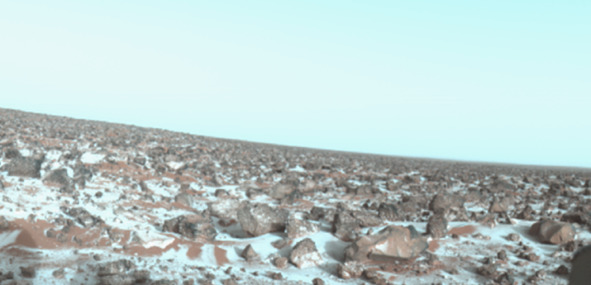Фотографии от «Викинга-2». Равнина Утопия. На фотографии слева зритель видит сначала ярко оранжевое небо. Это видно на фотографии справа. А затем американские фальсификаторы показали просто светлое, почти белое «марсианское небо». Светлое небо продемонстрировано на фотографии справа. Подпись под фотографией: «Первое цветное изображение, переданное спускаемым аппаратом». [8] Впрочем, американские фальсификаторы перестали скрывать истинный цвет неба на «Марсе» США. Обманщики НАСА перестали стесняться и манипулировать с цветом «марсианского неба». В виду того, что никто не пытался уличить обманщиков в откровенном обмане, они перестали стесняться и продемонстрировали земное, голубое небо. Это продемонстрировано на снимке, расположенном ниже, где продемонстрировано земное, голубое небо, земные пейзажи и земной снег. Подпись под фотографией: «Снег на Марсе. Мороз на посадочной площадке». [8]