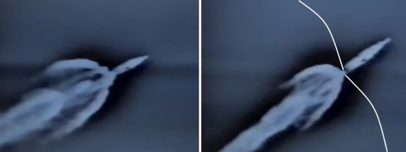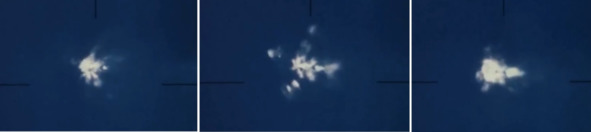 На первом кадре наблюдается поднятие правого нижнего края навеса, на втором кадре, под воздействием какого-то воздушного потока, край навеса смещается вперед на заметное расстояние. Наконец на третьем и четвертом кадрах продемонстрировано колыхание этой части навеса. В результате чего, серебристая поверхность другой стороны навеса, стала видна. На других снимках обратная сторона навеса оранжевая.