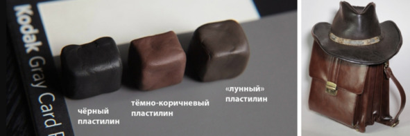 Кинооператор игнорировал эти факты. В своем эксперименте Леонид Коновалов некорректно выбирает сравнение между лунной, неровной, изрытой поверхностью, с одной стороны, и гладкой поверхностью кубиков пластилина и темной шляпы из кожи, с другой стороны. Слева: Рис.9. Вот так – крайний правый кубик – должен выглядеть лунный грунт в том районе, где по легенде была посадка «Аполлона-11». Справа: Рис.66. Коричневый портфель и тёмно-коричневая шляпа. [6] Автор заранее подбирает пластилин такого цвета, который, как он полагает должен соответствовать темно бурому цвету: «Из этого пластилина, похожего по цвету на лунный грунт, мы вылепили кубик и сфотографировали вместе с эталонной серой шкалой Кодак, не забыв положить рядом кубик из черного пластилина и исходного тёмно-коричневого. Вот такой цвет имеют лунные моря – как на кубике справа (рис.9). Таким должно выглядеть Море Спокойствия, куда по легенде прилунился «Аполлон-11». [6] Автор мог использовать и другие виды пластилина других цветов с гладкой поверхностью и у него бы получились очень близкие результаты, которые исследователь получил в случае с темно коричневым материалом. В такой ситуации результат опыта нацелен не на поиск истины, а на подтверждение любимой гипотезы, которая понравилась автору. Но совершенно очевидно, что такое ошибочное сравнение ровного, гладкого объекта с неровным и изрытым грунтом и приводил Коновалова к ошибочному выводу. Автор рассматривает категории диффузного отражения и сравнение отраженных световых потоков, которые зависят, как это было сказано ранее, не только от цвета объекта, грунта.