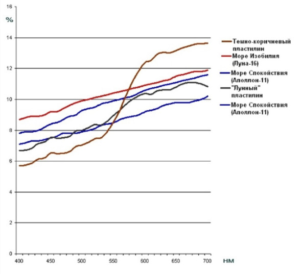 Автор ошибается, и это видно из его графика и кривой спектрального отражения «темно коричневый пластилин», которая не совпадает с кривой спектрального отражения образцов Лунного Грунта из Моря Спокойствия. Автор сам показал наглядно отличие этих кривых. От 550 нм (это зеленый цвет) кривая спектрального отражения коричневого пластилина резко уходит вверх. Это не совпадение, да и от 400 нм до 500 нм уровень (процент) соотношений отраженного светового потока ниже, чем такая же кривая спектрального отражения грунта из «Моря Спокойствия» (Аполлон 11). Автор предполагала, что общий цвет Луны был красно-коричневый. Но цветные снимки от АМС СССР «Зонда-7» показывали темно оранжевый цвет Луны.