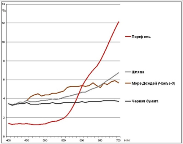 Рис. 67. Графики спектрального отражения портфеля, шляпы и лунного грунта. Автор начинает сравнивать чёрную бумагу, коричневую, гладкую шляпу, коричневый, гладкий портфель, ржаной хлеб с поверхности китайской «Луны», которая на самом деле находится в пустыне Гоби. У автора возникают большие проблемы в таком сравнений с китайской «Луной». Не совпадают «спектральные кривые» хлеба, шляпы, черной бумаги, портфеля со «спектральной кривой» от китайского «Моря Дождей». Леонид Коновалов не учитывает степень неровности «лунной поверхности». Он не учитывает, что в реальном лунном грунте может содержаться светоотражающее вещество, которое изменит параметры отраженного светового потока. Такой метод определения цвета Луны дело совершенно безнадежное. Но автор не понимает перечисленных проблем. Ссылаться на «китайскую» Луну серого цвета это не лучший вариант.