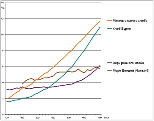 А добавлением вкраплений черного пластилина снизили общий коэффициент отражения. После тщательного раскатывания пластилина до однородной массы и промера на спектрофотометре, мы получили почти такую же кривую спектрального отражения, как у образцов лунного грунта из Моря Спокойствия. Эту кривую отражения приводят американцы для области, куда по легенде прилунился «Аполлон-11». [6] При проведении подобного опыта необходимо было не тщательно раскатать пластилин, а тщательно покрыть поверхность пластилина впадинами и отверстиями различного размера, чтобы его поверхность стала неровной и ноздреватой. Но автор сравнивает ровную поверхность своего образца с неровной поверхностью Луны, с сомнительными американскими образцами, которые сами требуют проверки в своей подлинности. Такое сравнение с возможно ложными образцами является неправильным, ошибочным методов сравнения. Автор не понимает и такого момента методики, что необходимо сравнивать верхний слой реголита, а не образцы глубинного бурения настоящей Луны. Цвет образцов на глубине может кардинально отличать от цвета поверхности планеты.