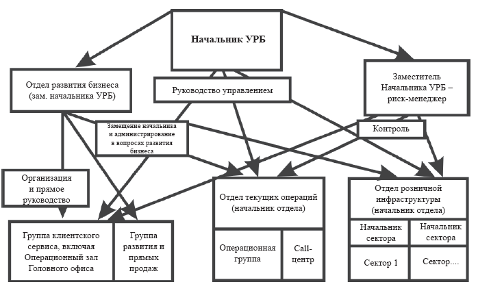 Для начала приведем пример структуры Управления розничного бизнеса, основное направление деятельности которого развитие в основном комиссионных продуктов в сети дополнительных офисов и карточного бизнеса целиком в банке. Естественно, что если стратегия банка нацелена на другие задачи, то данная структура изменяется в зависимости от решаемых задач.