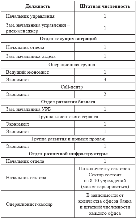 Развитие розничного направления в банке, как правило, приводит к увеличению штатной численности подразделений, что привносит свою долю проблем в условиях дефицита профессиональных кадров на рынке труда. Хотя кризис 2008 года внес свои коррективы в кадровую ситуацию на рынке, но значительно увеличить количество профессионалов он пока не смог. Поэтому, действительно профессиональные кадры даже в такой ситуации остаются в дефиците, что и заставляет принимать в розничные подразделения сотрудников имеющих малый опыт банковской деятельности и производить их обучение на месте. В свою очередь понятно желание любого работодателя получать максимальную отдачу от каждого сотрудника с первых дней работы, что возможно только в случае наличия четко прописанных должностных обязанностей и операционного расписания, а также при условии структурированного подразделения розничного бизнеса. В этом разделе будут приведены практические наработки по созданию Управления розничного бизнеса, а также определены краткие должностные обязанности каждого сотрудника и набор параметров, опираясь на которые возможно производить набор недостаточно профессионального персонала. Кроме того, приведен пример операционного расписания подразделения по обслуживанию платежных карт, чеков и переводов, позволяющего регламентировать по часам деятельности каждого сотрудника.